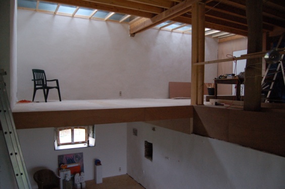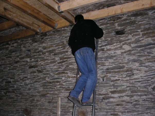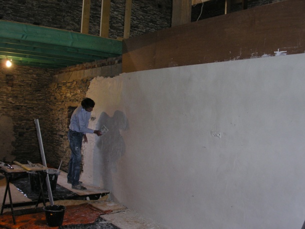 2005, september. De binnenmuur op de begane grond wordt glad gestuct.