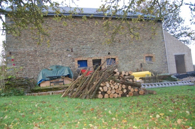 Achter het huis ligt een grote berg hout van de gekapte esdoorns, dat levert weer warmte voor vele weekenden.