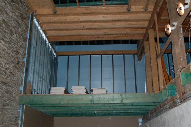 2006, april. Langs de wanden wordt met profielen en gipsplaten een binnenmuur geplaatst.