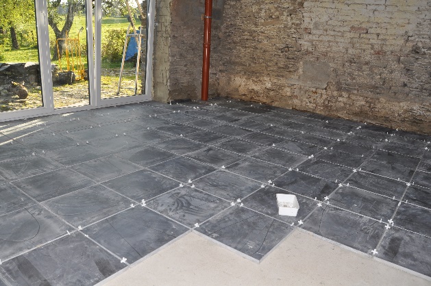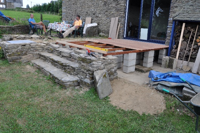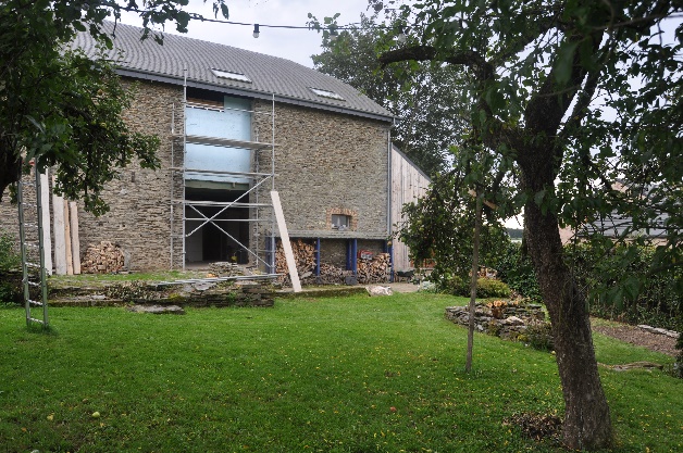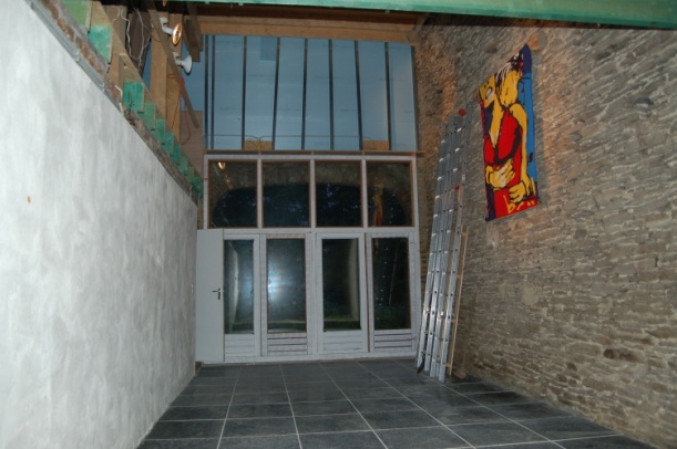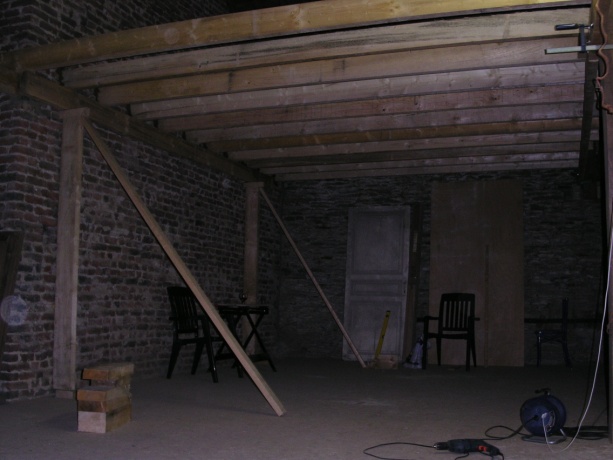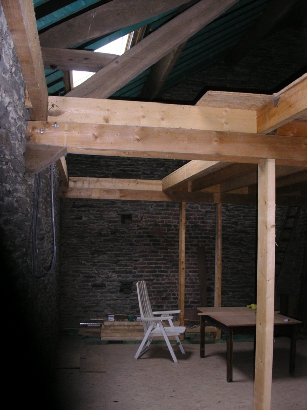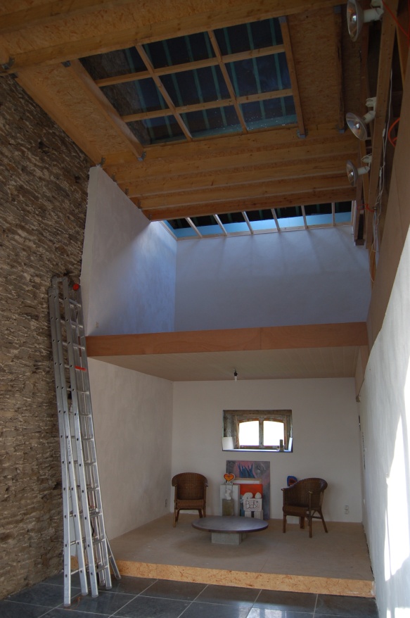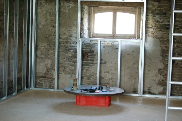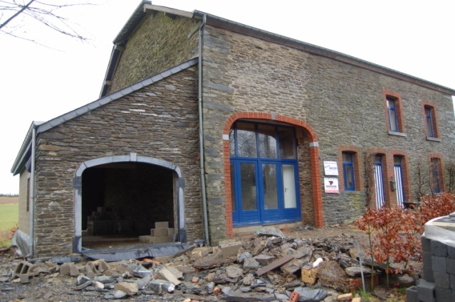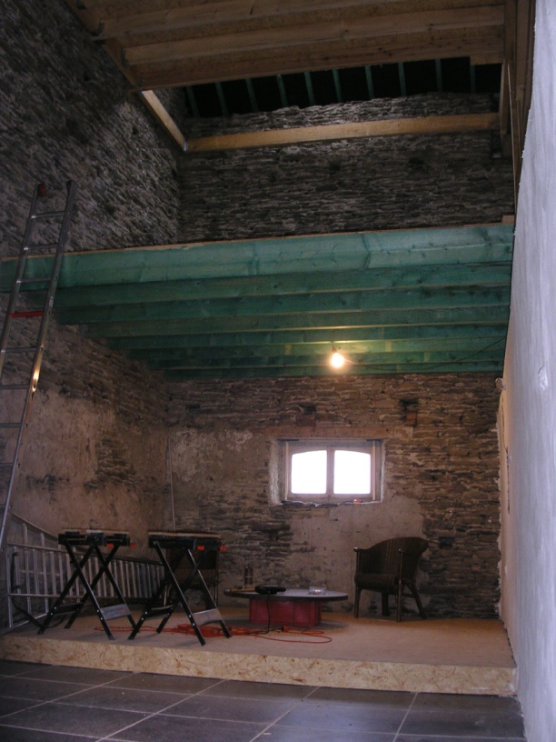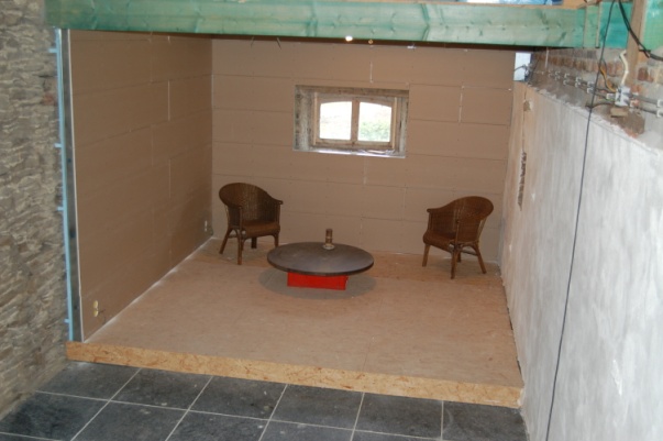 De voormalige stal krijgt een nieuwe vloer, enkele muren worden gestuct. Met een gaskachel is het ook in de koudere maanden een aangename ruimte geworden.