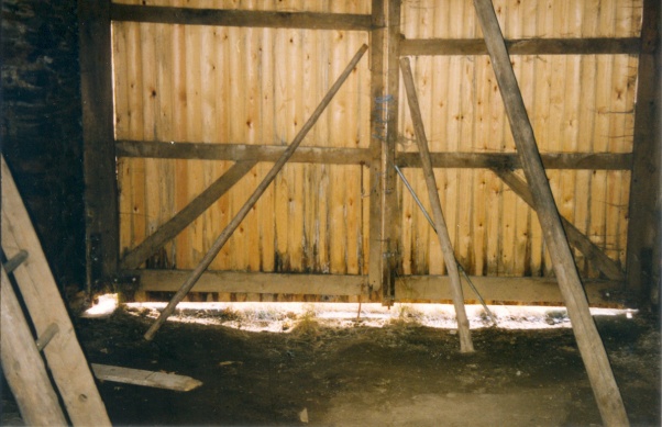 De poortdeur werd op zijn plaats gehouden door een verzameling balken en stokken. Bij een beetje storm klapperden de deuren.