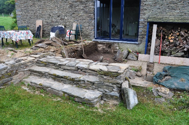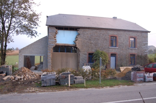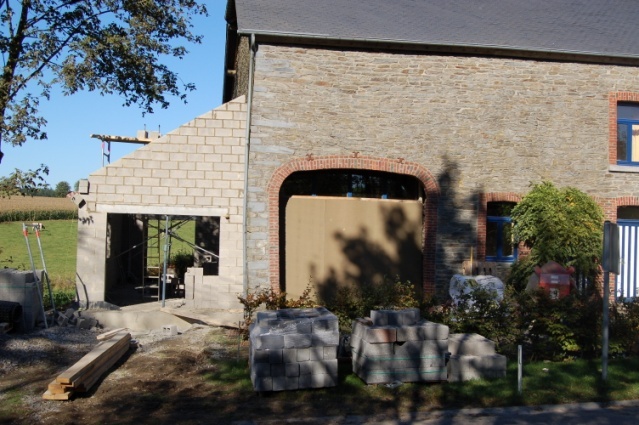 Het werd tijd om uit te breiden. Er komt een schuur of garage naast het huis; het is meteen een goede gelegenheid om de muur boven de poort, die scheuren vertoont, te laten opknappen.
