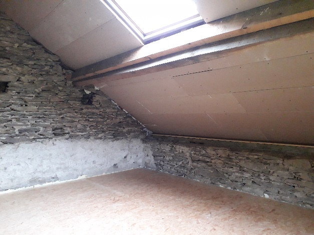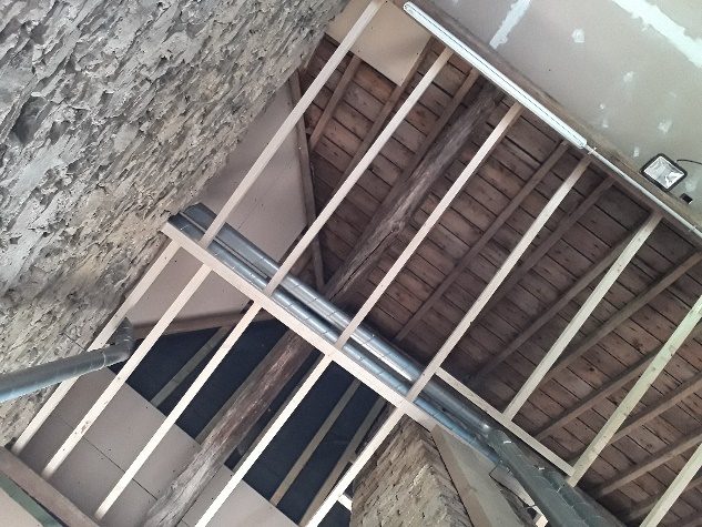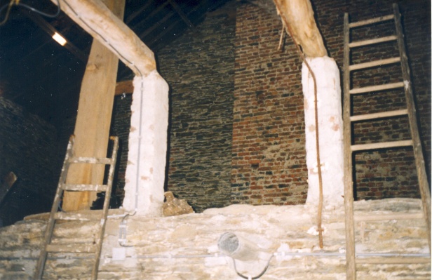 De gemetselde ommuring van de trap naar de zolder in het andere deel van het huis is zichtbaar.