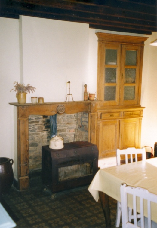 In de woonkeuken stond een oude kachel en wat versleten meubilair.