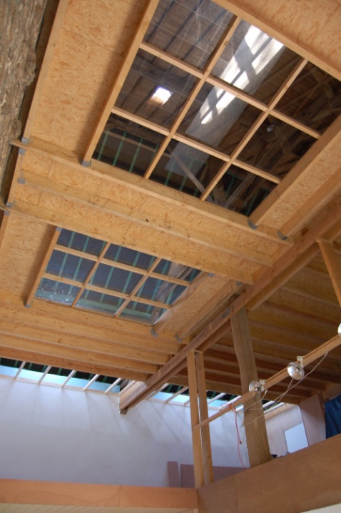 In 2019 starten we met het dicht maken van het dak. Nadat het eerste deel is bedekt met gipsplaten, blijkt de nok erg bewerkelijk met grote balken en buizen. We besluiten een plafoond te leggen.