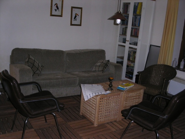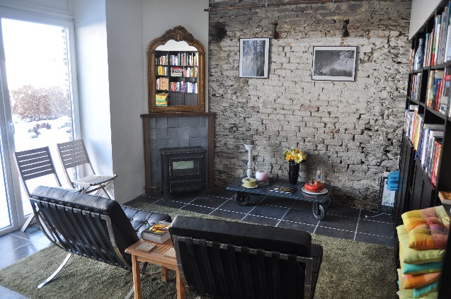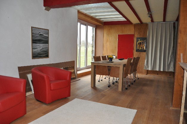 De eikenhouten planken vormen de finishing touch van de eerste verdieping. Met een paar gemakkelijke stoelen, een bank en een tafel is er ruimte genoeg om te lezen, te luisteren en te ontspannen.