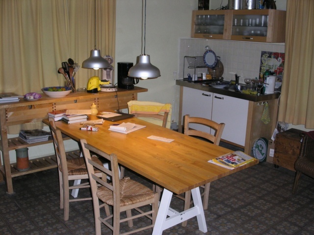 De keuken heeft een nieuw Ikea interieur, maar de oorspronkelijke tegels liggen er nog wel.