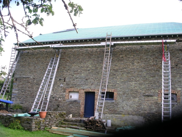 Een nieuw dak aan de achterkant was hard nodig, het regenwater werd met zeilen opgevangen in een ton.