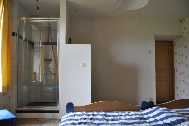De tussenstal is laag, de troggen zijn er nog. Een deel van de stal is gebruikt om een badkamer te maken.